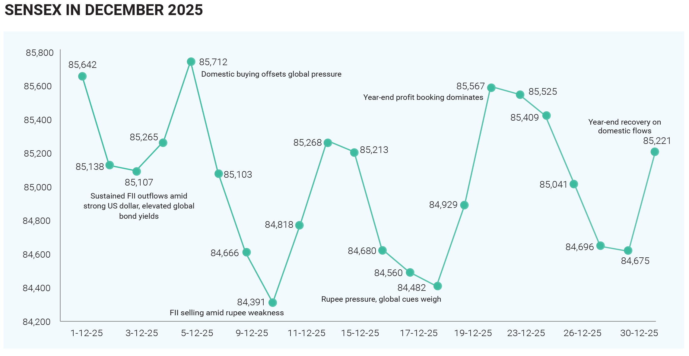 The divergence between foreign selling and domestic buying prevented deeper drawdowns, kept market breadth tilted toward liquid frontline stocks, and reinforced the perception that domestic capital had become the marginal price-setter. Sectoral performance was notably differentiated compared with November’s broad-based rally: IT stocks benefited from sustained global demand for digital and AI-linked services and from rupee weakness, which supported earnings translation and margins; healthcare and pharma held up well as defensive plays with stable demand visibility, particularly in domestic-focused names and hospital chains; energy stocks outperformed on value buying and policy support, with integrated and downstream players aided by lower crude prices and expectations of healthy refining margins; financials delivered mixed but generally supportive performance, with PSU banks and select rate-sensitive lenders gaining on expectations of strong credit growth and an accommodative policy path, while some private banks faced intermittent pressure due to concerns around net interest margin compression and pockets of asset-quality stress; consumer sectors saw profit-taking in FMCG after earlier resilience despite improving volume trends and easing inflation, while discretionary stocks were stock-specific, with autos supported by demand and rate-cut hopes but retail names consolidating after sharp prior rerating; utilities remained among the weaker segments, as concerns around tariffs, demand visibility and operational pressures capped enthusiasm, limiting buying to balance-sheet-strong names; and metals and industrials moved in a choppy but mildly positive fashion toward month-end, helped by import-related policy measures, domestic capex expectations and year-end positioning despite uneven global demand indicators. The macro backdrop during the month remained largely supportive domestically: Q2 FY25 GDP growth around 8% exceeded expectations, inflation stayed benign, and the RBI delivered a dovish policy signal by cutting the repo rate by 25 basis points to 5.25%, announcing ₹1 trillion in open market operations and a USD 5 billion buy/sell swap to inject liquidity, which helped soften bond yields and underpin sentiment. However, these positives were tempered by external pressures, including a firm US dollar, weak emerging-market currencies, geopolitical uncertainty, US trade policy risks, China’s deflationary signals, and falling crude prices, all of which reinforced caution among foreign investors. The rupee’s nearly 2% depreciation over the month weighed on foreign returns but also highlighted India’s relative resilience: instead of triggering disorderly selling, equities absorbed the shock through sideways movement as domestic flows cushioned the impact. By year-end, market positioning clearly favoured quality, earnings visibility and balance-sheet strength over high-beta momentum, with index valuations cooling modestly from peak optimism but remaining supported by earnings delivery and liquidity. Overall, December 2025 closed with Indian equities in a deliberate, balanced stance: headline indices near record highs but without exuberance, foreign investors cautious but not capitulating, domestic institutions firmly in support, and the market entering 2026 consolidated, selective and grounded in fundamentals rather than momentum.